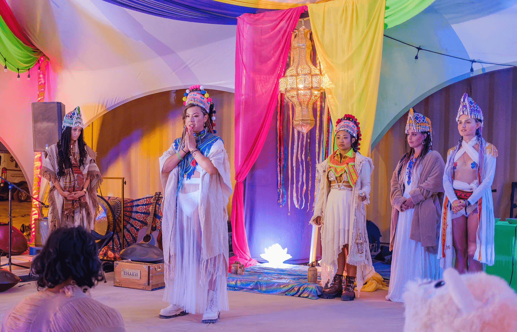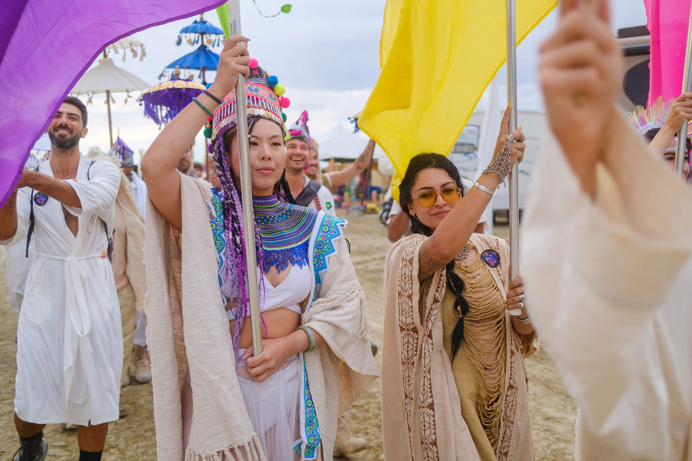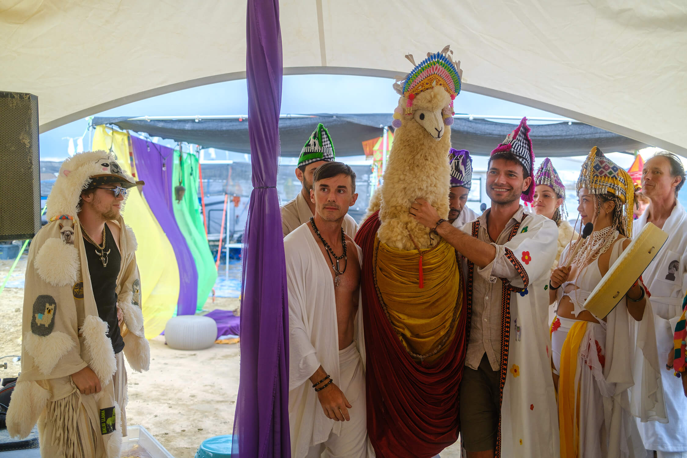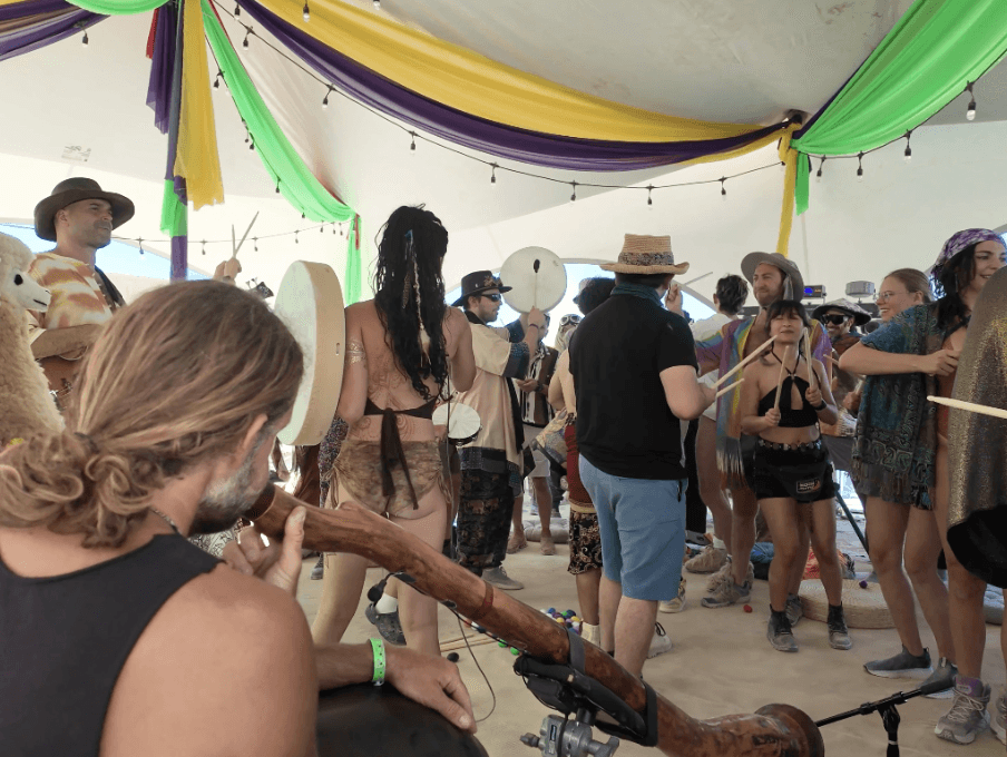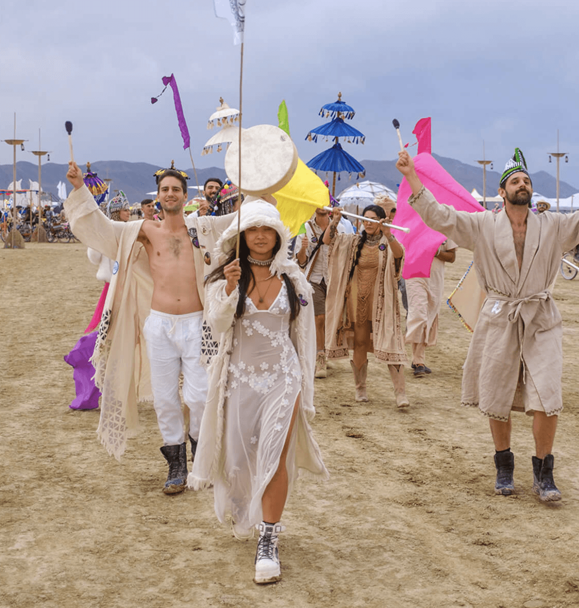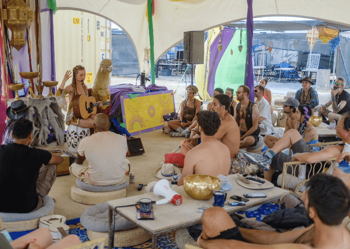 We make our own robes, build the temple before the gates open, and run sound healings, drum circles, and dance parties that keep the cosmic frequency in balance.
